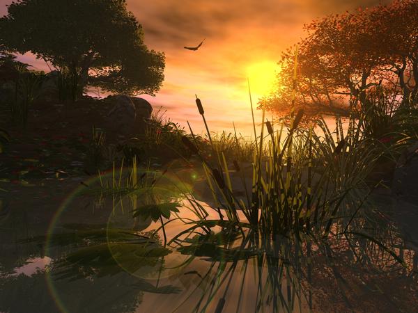 Looks like you used basic ambience instead of more advanced indirect lighting solutions like ambient occlusion or full GI. The most expensive rendering effect probably was the transparency of the leaves of the grass, but even that was mitigated by the general simplicity of the scene, there were not layers upon layers of leaves all transparent at the same time for the sun's rays to pass through. In such a state Bryce could produce the same render in the same amount of time. The issue really isnt making a swift render, its making it swift while still employing the more render intensive effects like AO and GI. The lens flare effect could not be applied in Bryce, but Carrara could do it.