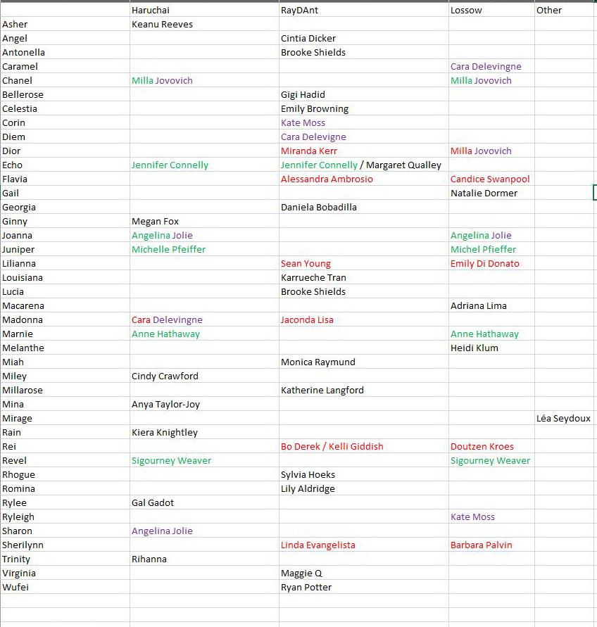 Here's the state of play. Black is only person has an entry for the character. Green is two people have the same celebrity for the same character. Red is two people have a different celebrity for the same character. Purple is the same celebrity is assigned to different characters. Some are in green, red and purple. Not to mention the ones with two guesses by the same person for the same character. Not sure I feel confident publishing a definitive list from this. Even the green ones could be down to cross pollination of previously published lists.