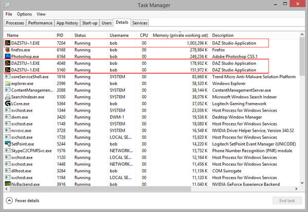 I came upon this yesterday when I went to set the affinity of my processor so I could do other things while rendering without slowing things down to much. Yesterday I had eight instances of DAZ open, so I ended the processes that weren't being used.