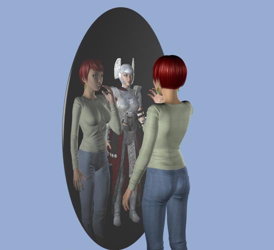 Thanks Scott, not sure what you mean by the phantom trick, but if you mean did I place the second character in armor out of camera range then yes I did. I am not too sure on how to improve the lighting for the mirror effect. I don't have any mirrors so I created a sphere, changed the shape into an oval and added a chrome shader to give it a mirror like appearance. Now I just have to figure out how I want to fill in the scene.