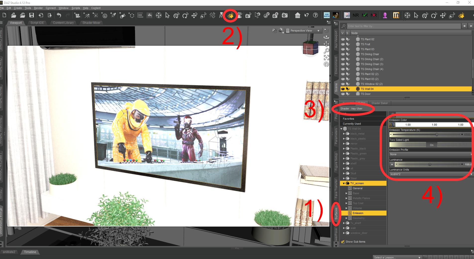 • Another thing, I've done this before myself because I'm a sucker for those small details that drag out the creation of a scene; take the image you have created to replace the "blank" texture of the television screen (also works with laptops, and apply it to the "emissive" section. This way your television is showing an image and radiating light. You may need to tweak the luminance with an iray preview session to get the desired level of light. This is definately a good use of your time and I hope your scene goes well.