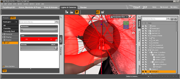 200% is as bright as a menu-point light will get, and it is not enough inside a Glow-effect to cast overwhelming light around the scene. A second one was needed for my attempt.