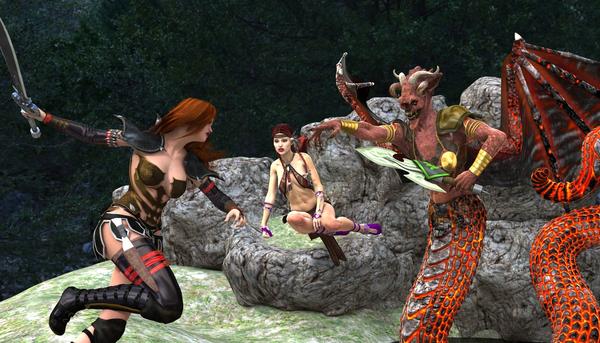 my first picture of Lilith morphed using the HD Creature Creator and the Succubus Add-Ons. The sword girl is Letizia for Lilith 6 wearing a mixture of items from the Lilith pro bundle and other packs girl on the rocks is Victoria 6