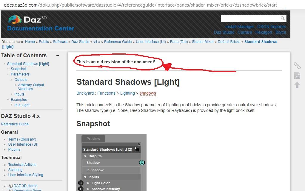 Clicking that brings up an old docs.daz.com/doku.php/... page - which looks depressingly similar to what existed back in 2013 when I last looked. However, the "This is an old revision of the document!" note (circled in red below) gives me some little (but probably forlorn) hope that perhaps it was updated ?