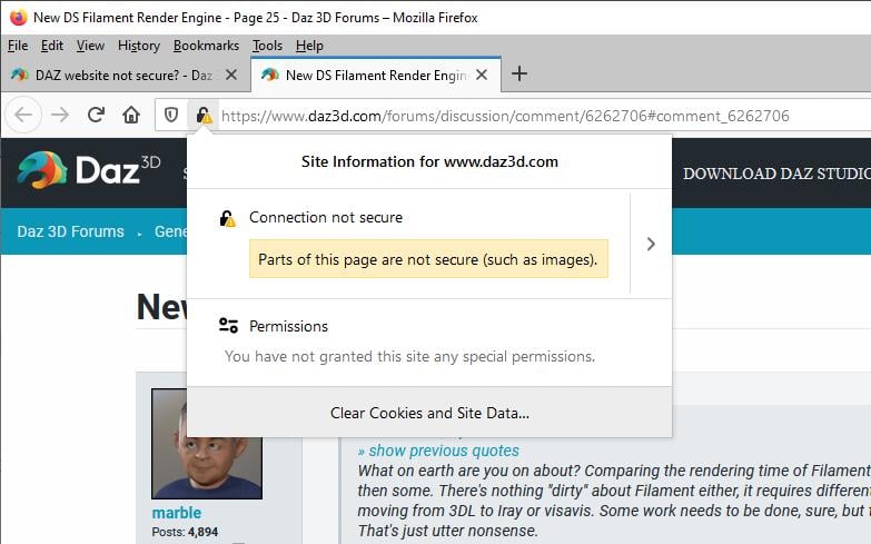 Ahh, ok Richard. I'm using Edge and the information text is slightly different, saying that images can be modified in order to trick the viewer. I was mainly concerned that there might be some areas of the DAZ web service that are not secured.