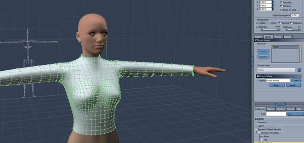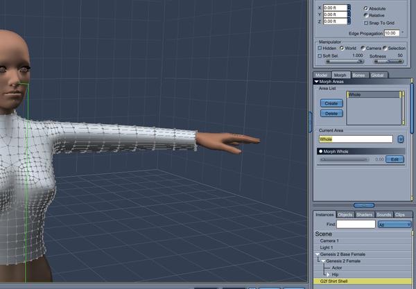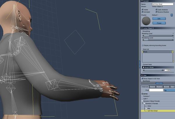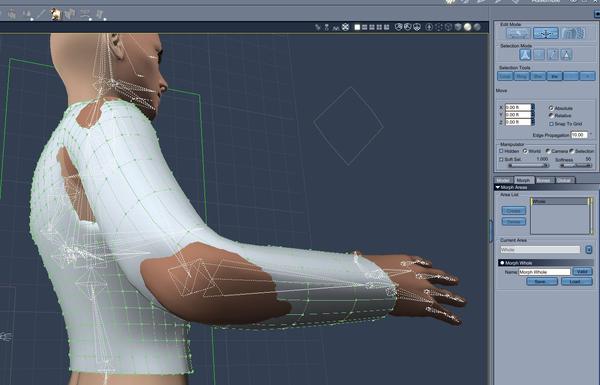 -Shape a shirt around the figure. Once you like your shirt, still in the vertex modeling function, click on the morph tab in the properties tray. You need to select all of the vertexes and create a morph area. I named the morph area "whole."