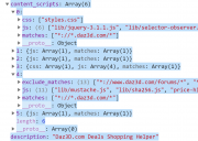 Anyway, I added a breakpoint to globals.js and, yep, it is being run after all the errors.  It's called (loaded) from "anonymous" (i.e. there is nothing else on the call stack).  If I put a breakpoint on the first line of price-history.js then I can see that it is definately called first, from "anonymous".  The "Manifest.json" is correct, however by setting breakpoints on every DAZDeals file I can see that the problem really is that the line which does the "exclude-matches" extras on the match of "matches": [ "*://*.daz3d.com/*" ] really is the first one loaded; before access-storage.js.  access-storage.js is loaded immedately after the .js files in the previous entry (this is a product page).  Then, and only then, is the first entry run, loading jQuery, selector-observer, globals.js.