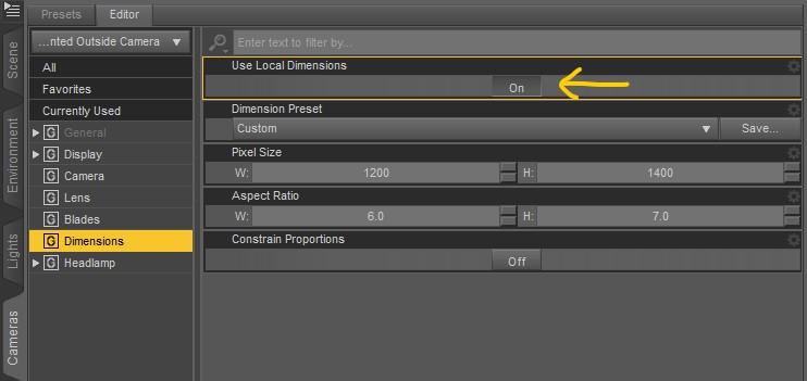 The camera has Local Dimensions turned On because the camera's render size has been adjusted for the Stand Kit's dimensions. You can turn off Local Dimensions by going to the "Cameras" tab, but please keep in mind that if you turn off Local Dimensions you may need to manually adjust the size of the Stand Kit, depending on your render dimensions. :)