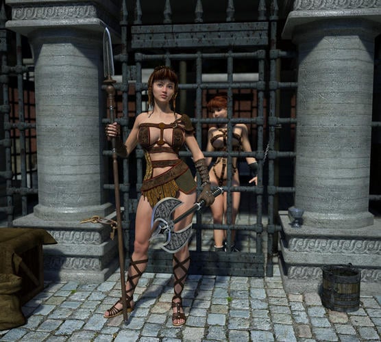 I added the bucket and chalice on the right side of the image, and adjusted the specular and highlight values, both looked very flat. I didn't edit any of the materials on the grain bag, crate, or crate cover/blanket. I also added a custom V4/G4 character inside the stockade with shackles/chains. I only did some very minor editing of materials on the second figure.