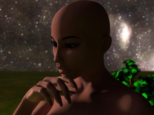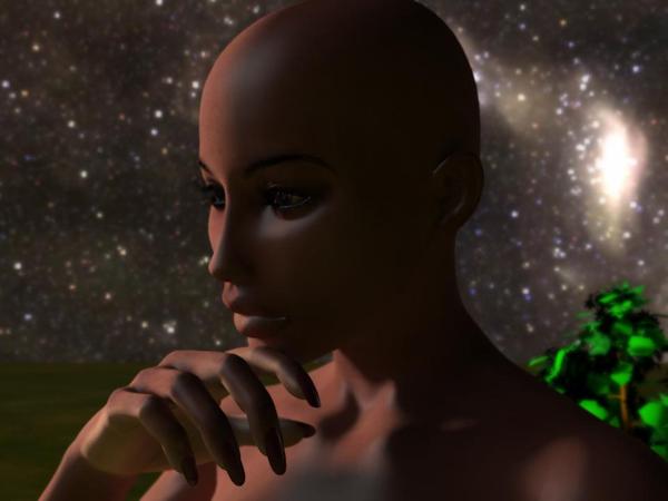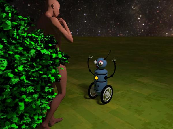 And now for the reveal! In the 4th image (which will evolve into my contest entry), Naeima meets Probe or is it Probe that meets Naeima in the Garden of......... Probe is an AI bot gone rogue, I modeled him about 3 years back in Form Z and brought him into Carrara earlier this year, where I re-textured and rigged him- weight painting and all, worked out pretty well in the test animation I did then. He hasn't resumed the adventures he was created for so I'm borrowing him for this contest. The clump of bush that helps Naeima meet the forum's nudity guidelines was created in the Carrara plant generator. The plant generator is alien territory to me, so any time I go in there, I just fiddle with all the controls and hope I don't get a carnivorous plant that will eat its way out of my computer screen.