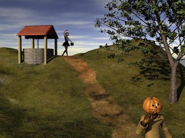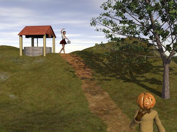 And Jill can't go up the hill all alone. There is a Daz figure called "Jack O'Lantern." I tracked him down, brought his texturemap into PS, and added the evidence of why Jill wanted to take him to the hilltop - and it wasn't for water, you know what I mean? Actually, it was pretty easy to cut and paste some lipstick on to Jack's face.