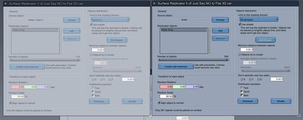 My water droplets are on 3 flat sheets, one the width of the whole monsters outstretched arms, and two smaller ones, one for each arm, plus 1 replicator for the monsters body. Here are two of the 4 water drop replicator settings. The other two have a 50% and 70% random size setting.