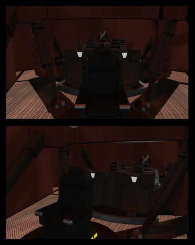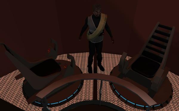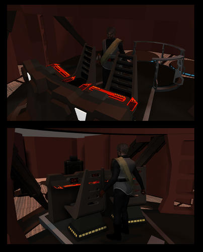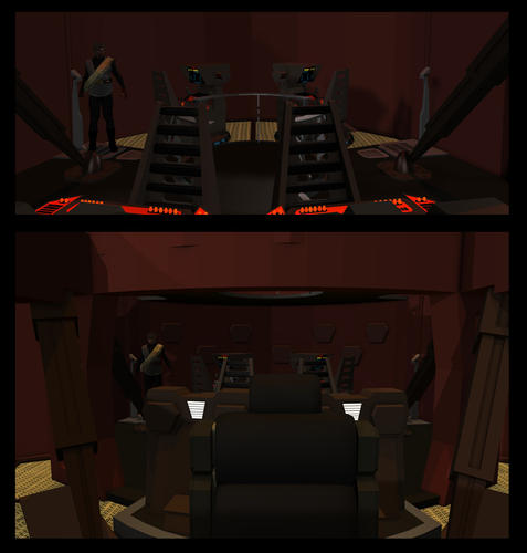 Okay, top picture. The object than Kang is standing on- I stared at the diagram for a week before I finally figured out that it's a one-person lift to the top deck, where the ship's primary sensor set-up is located. Adding that deck presented 3 situtations: