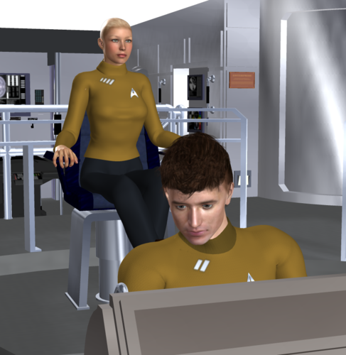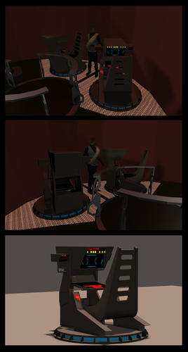 Subtitle this one "Brainstorm". After posting Update 14, I went back and looked at the screencaps again. As best I could tell, there were computers behind the weapons stations and the monitors looked similar to the movie comps I'd built for "Special Report". Looked again, and the ceiling had supports that looked like the ones I'd made for "Last Voyage of the Sundown". So I went digging. Sometimes it pays to keep all your bits and pieces. As far as I am now concerned, that part of the bridge is done.