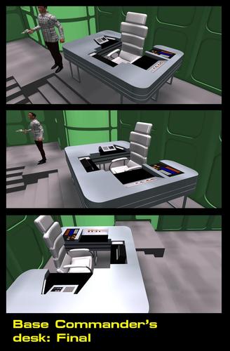 Working on the Base Commander's desk. Top 2 pics are screen shots from Sketch-up. The bottom 2 are renders from Poser 9. Lots of buttons still to be done, plus another side of the desk yet.