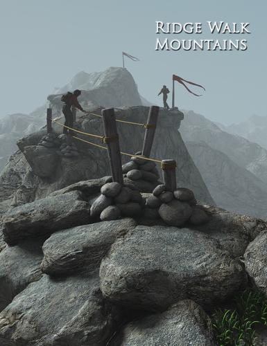 Includes the ridge walk, the surrounding mountain range, the rocks and rope bridge and sparse grass props. The wind flags are also included and have built in morphs to allow for some flutterring variabililty The overcast sky is the wysiwyg fog cameras F/X in DAZ Studio 4.6+ with 13 fog cameras included.
