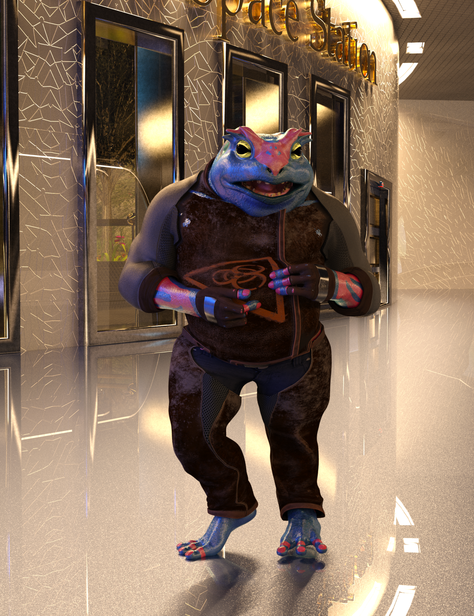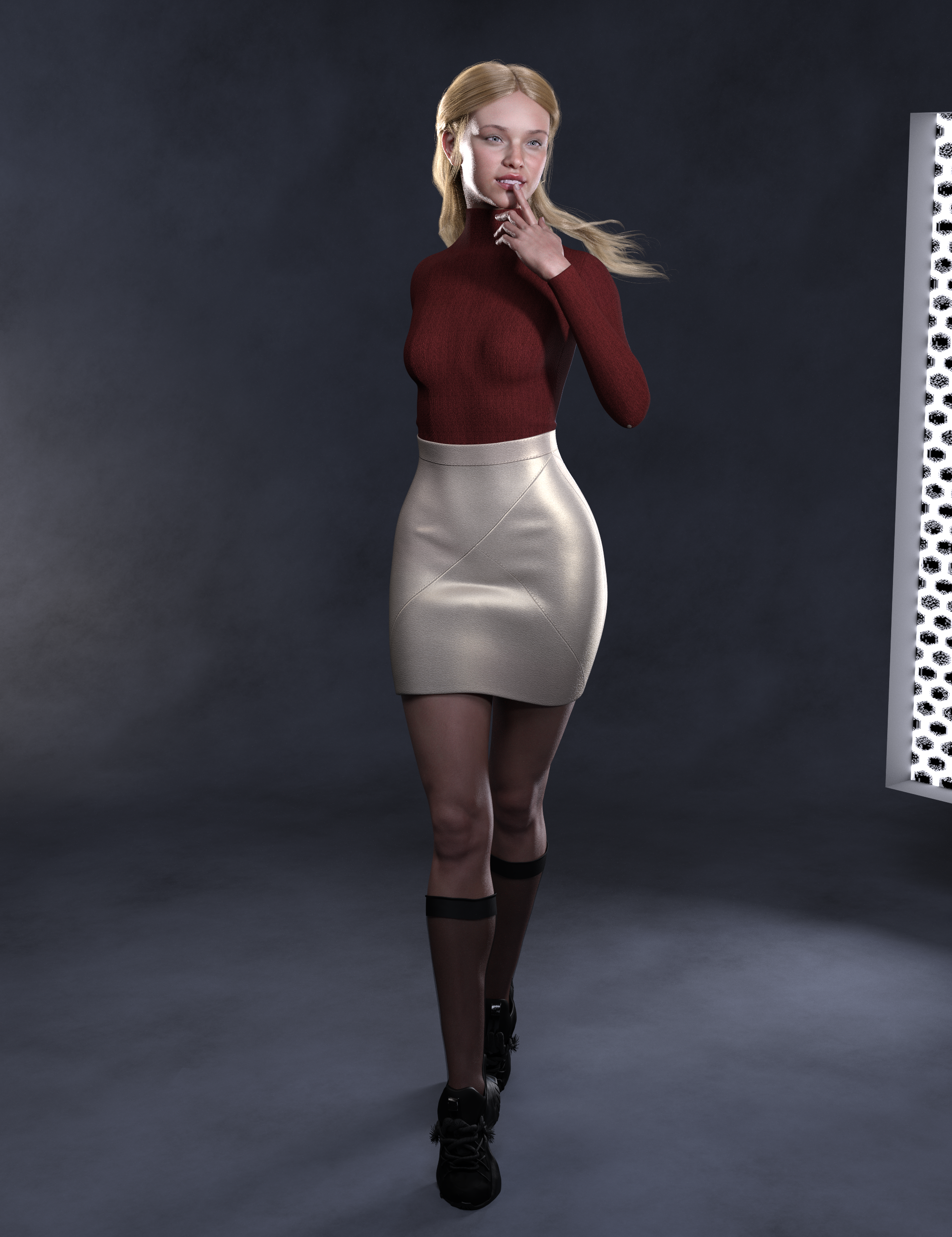 I worked a lot on this one between dforcing the skirt and blazer and setting things just right including timeline poses to encourage specific folds and trying to get the leather looking polished but not too glossy. I had to hide so much stuff out of the camera's view. I used lights from Boss Pro Lights