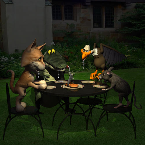 Bryce 7.1 (free version) Cages, tables, landscape, lighting, room elements and environments were created and assembled in Bryce.