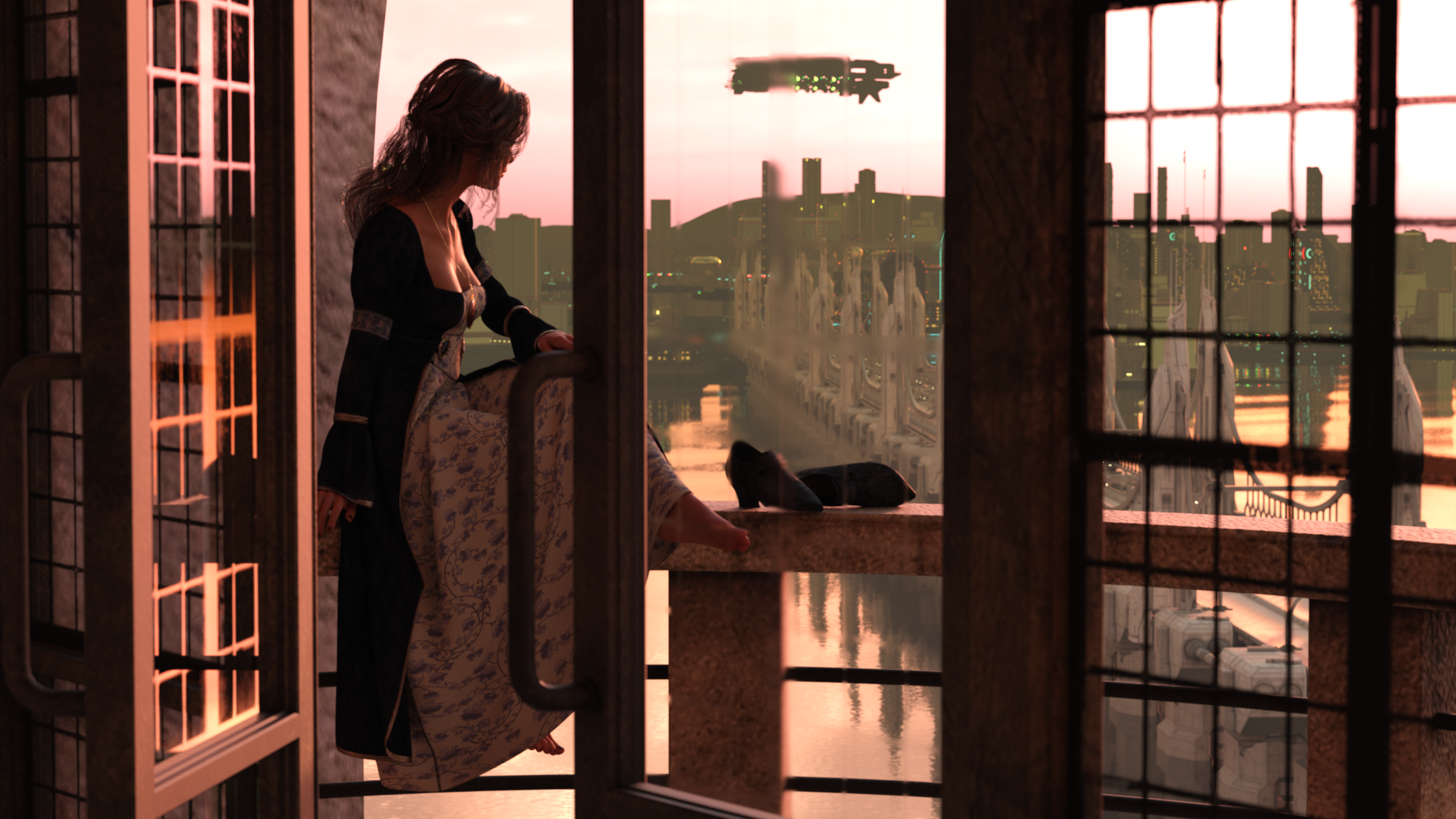 I made a few alterations. I unlocked the rotation of the balcony door to open the doorway up fully, changed the HDRI to a brighter image with a bit more blue than red and added some sky traffic. The billboard I made for the traffic did not play nicely with the default Iray fog settings so I replaced it with layered TerraDome3 atmospheres. I did end up rendering in two passes however. The foreground is a separate render from the full background and layered for this result.