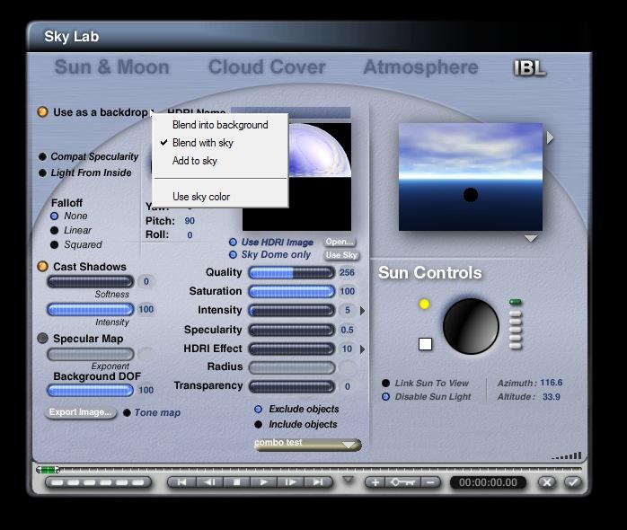 Slepalex, I have created in the IBL each time. I choose 'use HDRI image', then I choose 'sky dome only', then I click on 'use sky'. Attaching a screen shot. Sometimes I choose use as backdrop, or blend with sky and sometimes I don't. I then save the sky by adding it in my library.