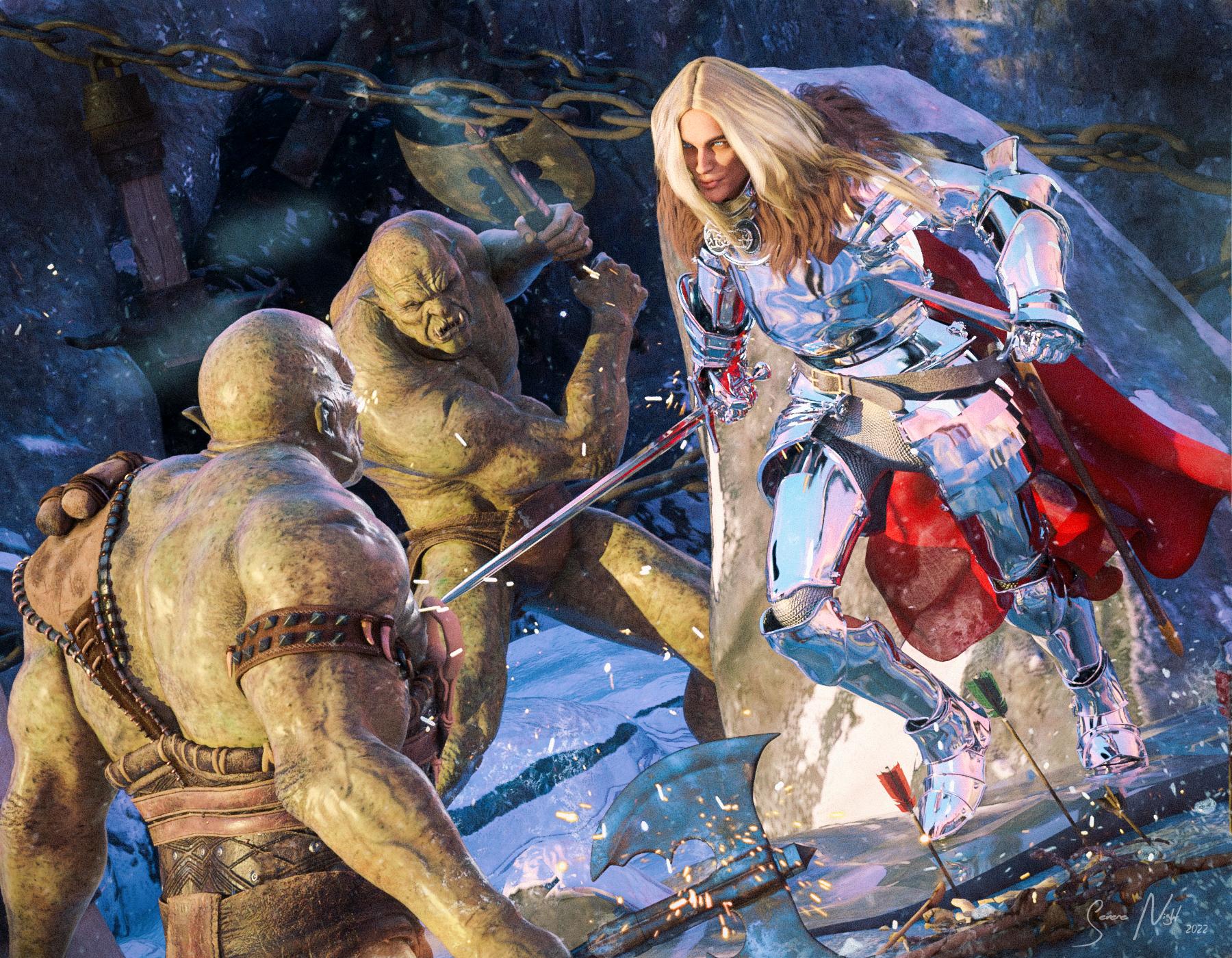 This has nearly everything happening in it. I updated the orcs, added some arrow-littered bones on the ground, and altered the outfits some.