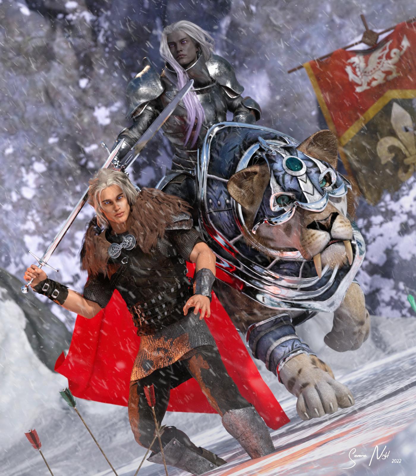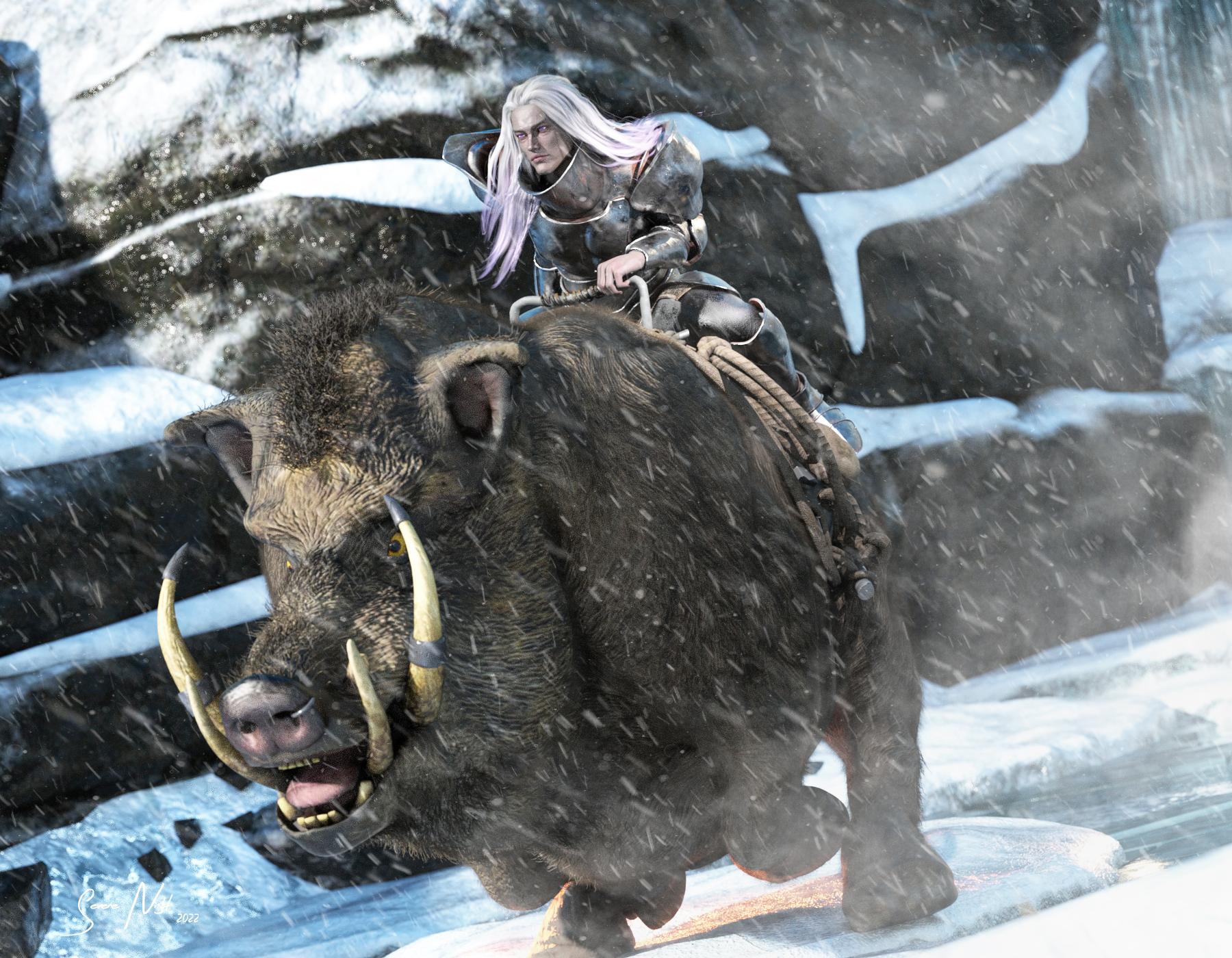 The battle boar is just awesome. Here is Noor riding him (?)  with the BattleWorn armor for Genesis 8 Male. Normally I think the pauldrons are really huge but, it works here, I guess because his arms aren't raised too much. The neck piece can also be a bit of a hazard, so only use this outfit, with a character with their arms down, and head facing straight.