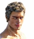 Troy hair: A long combed forward style completely obscuring the hairline, with shaggy sideburns.