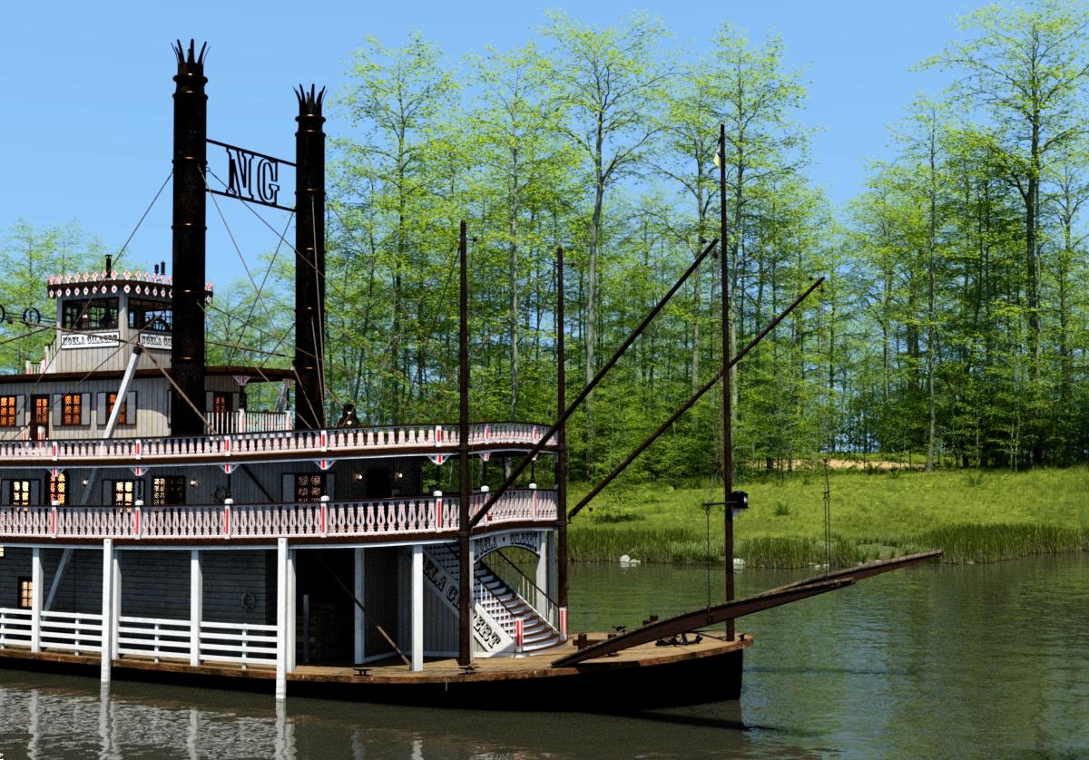 This 3D boat is drawn from the Marieville plans, a Mississippi paddleboat steamer from the 19th century (1884). I can not use the original name because of the copyright laws (a wood model of that boat exists) and I name it "Noela Gilbert" (in a first step I use "Mamy Gilbert" but because of the censorship, I've to changed it) and I add personal and original details. The name can be changed easily from the texture and, if necessary, I can do it for free for anybody who mail me the request. At that time the main sign between the two funnels must be adapted too.