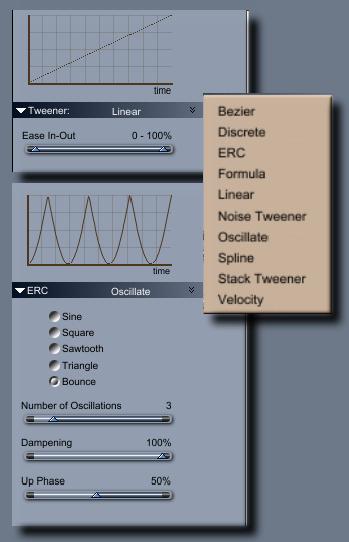 Oscillate gives us various options for repeating the two keys (two keys for each selected aspect) back and forth. Sawtooth works perfect for having a video repeat. 30 frame video at 30fps would have two oscillations to complete 3 seconds at 30fps. The first run, and then two more oscillations. Bounce uses a curve to determine how smoothly the animation goes from A to B, with B being at the climax that sends it back down to A using the inverse of the first curve, which can be editing for timing purposes. Perfect for creating things like jiggle, jello bouncing, etc., Sine is more like a Bezire that repeats as many time as we ask it to.