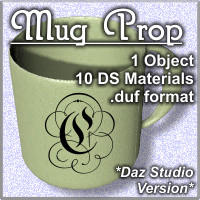 As promised, here is the Daz Studio specific version of the coffee cup/mug prop. This comes in .duf format, with one prop object, and 10 Daz Studio material settings. I built the materials inside of Studio, and while I'm still learning the ins and outs of DS's materials, I was aiming to try and make sure the DS folks didn't have to do a whole LOT of texture tweaking of Poser MATs just to use the object.