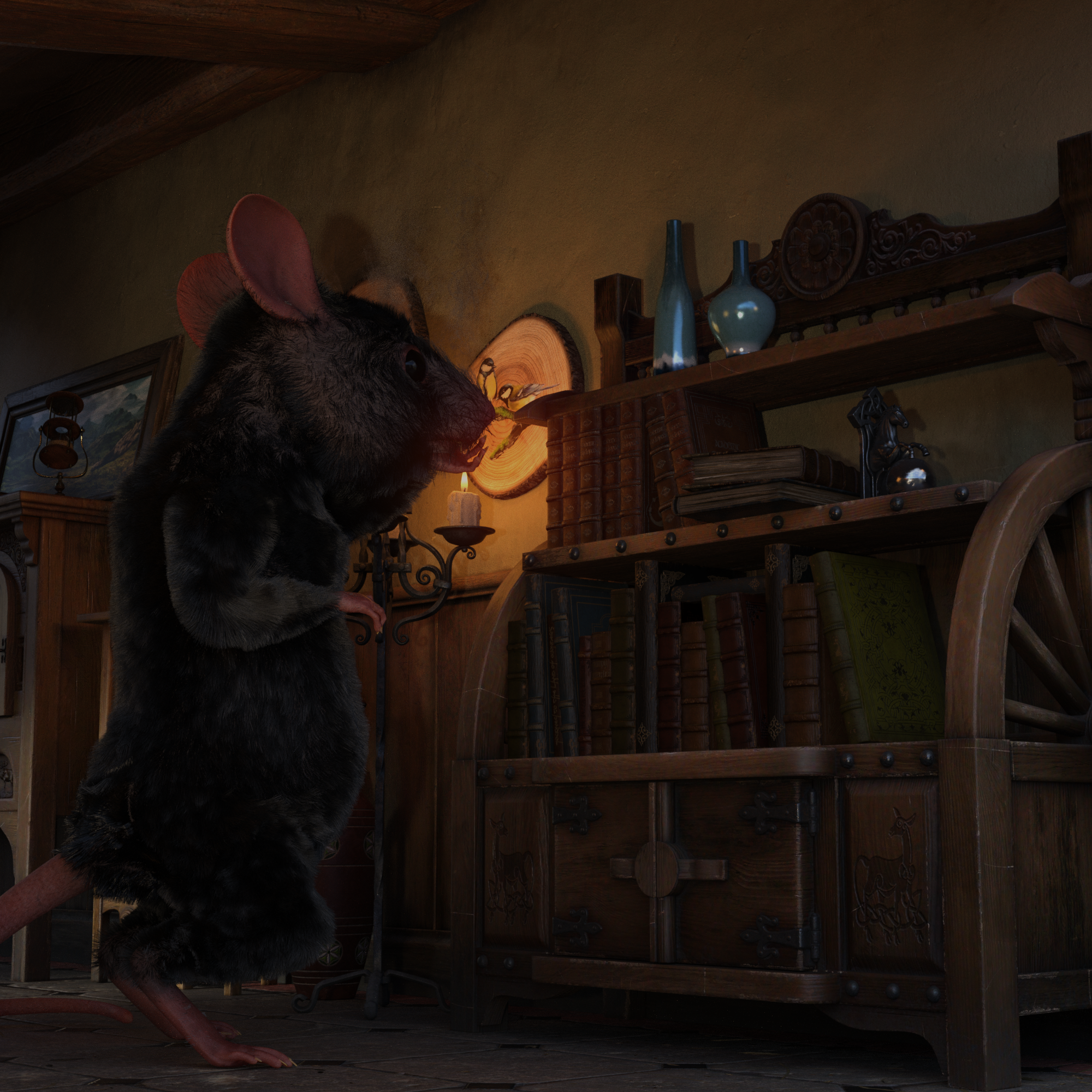 I tried one of the short hallway vignettes and after a test, added a Mouse. About six renders and four reboots of my computer later, I have one I want to share. This is not an issue with the product, but the hair on the mouse and my computer gets fits. I love the hallway, the various sets, and the furniture.