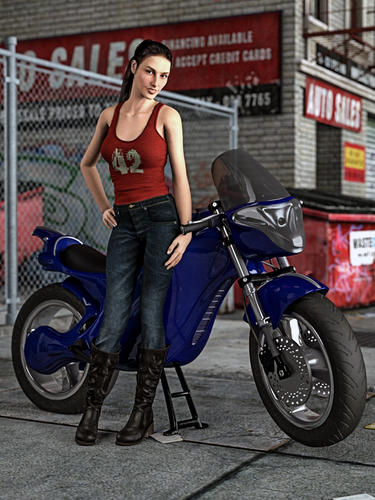 These too are looking good, Atticus. You found the perfect setting and vintage-sepia style tones for Indiana, and SpeedGirl is going to turn some heads! The bike retextured nicely and everything comes together to create a realistic-looking scene.