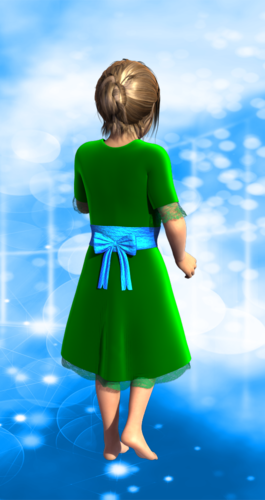 I mostly worked on this due to a lack of outfits suitable for children. The neckline is a modest jewel neck, and the lace on the sleeves and skirt can be hidden as necessary. There's also a bow on the back.