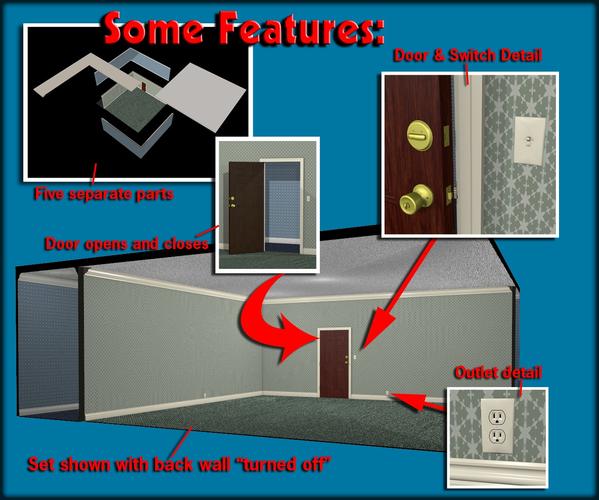Just a simple room with a posable door (dial operated), separate walls that can be turned on or off (read the included "ReadThisToo" document to find out how to "turn on" a wall… and also what turns them off)… (mostly stuff like lying and hanging things with nails)… separate ceilings, separate light switch and outlet, and a small section of hallway.