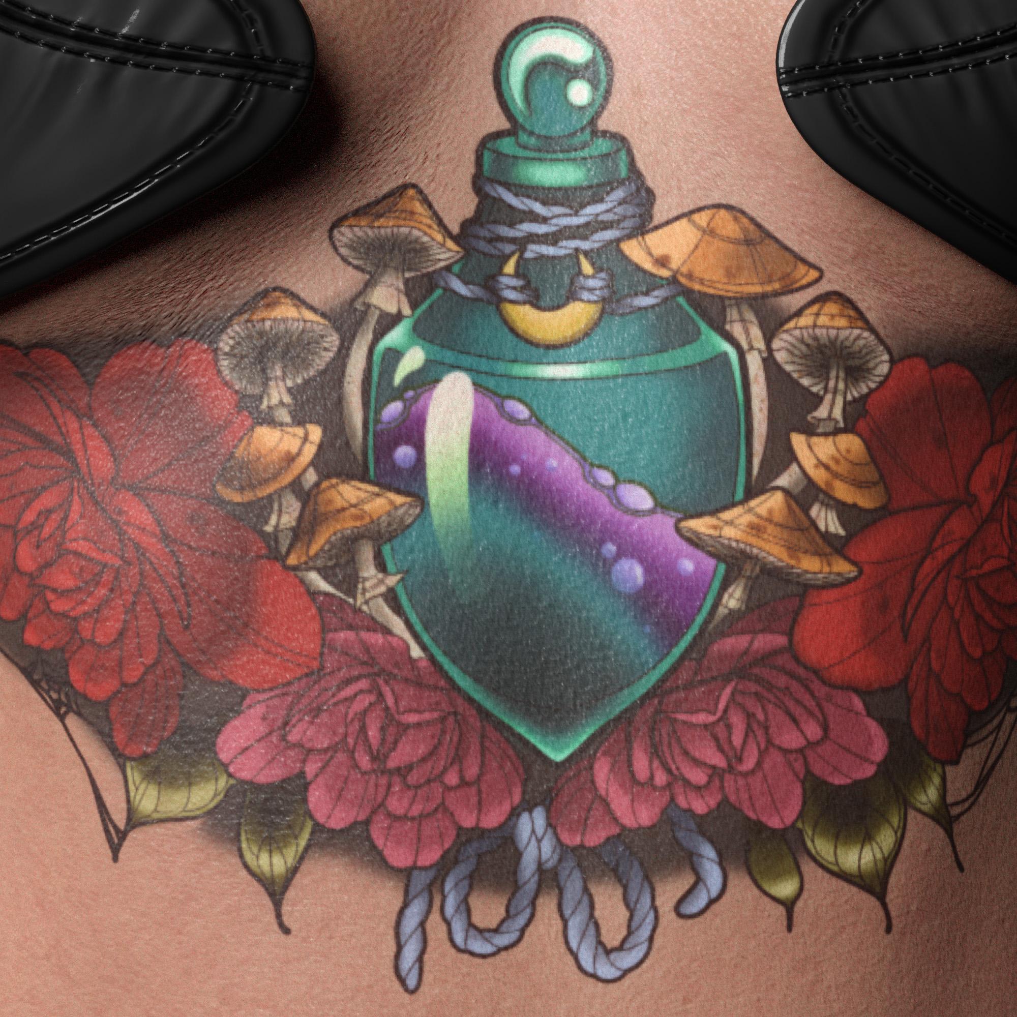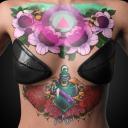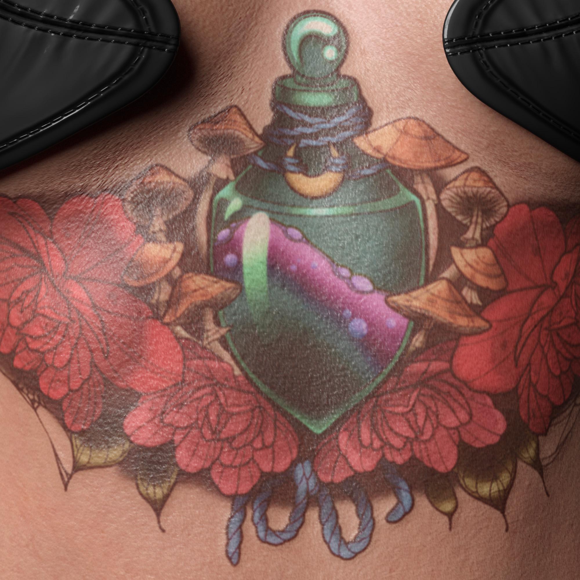 I probably went a bit too far with reducing the colors, but i'm pretty happy otherwise. I've incorporated layered blurring and density variation for the ink under the surface, as well as lightly layered the base skin back over the top to simulate an older tattoo. I then added some of the original skin details back over the top using a highpass filter to break up the solid colors further. A custom normal map gives a slight overall bump with the black outlines being raised higher still, which has been incorportated into the roughness map too. This is because tattoo outlines are usually done with a tight grouping of needles like a pointed paint brush which tends to cause more scar tissue. Large shaded areas are usually done using a wide grouping of needles like a flat paintbrush which allows for smoother blending between colors, and less overall damage to the underlying skin surface.