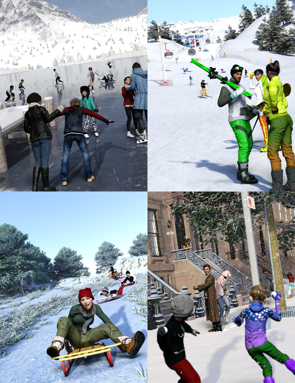 Winter has come and it is time for some fun! Fill your winter wonderland scenes with a variety of people skiing, sledding, skating and snowball fighting in high quality, flexible and easy to use billboards... perfect as a backdrop for the main action that you add.