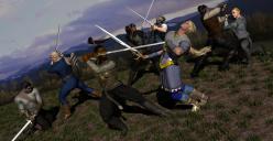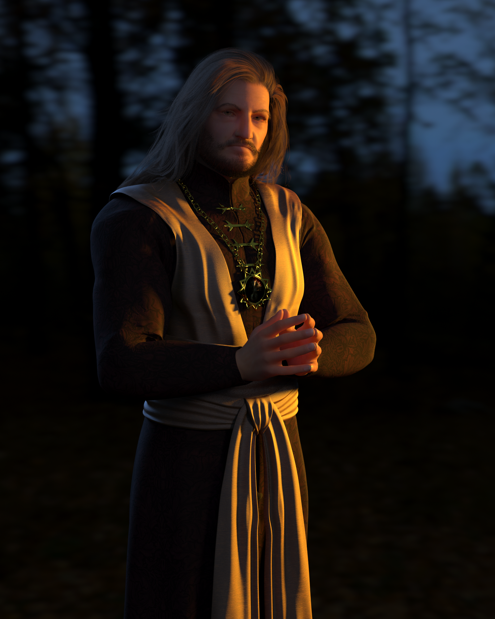 By the way, to give you an idea of how versatile G1 is, the central female figure's outfit is kitbashed from 3 Genesis outfits (Wolf King, Caput Caseum, and Alruna), and her hair is two freebies combined, 3Dream's Boy Hair for V4 and AprilYSH's Horsetail for V4; the central male is wearing Luthbel's High Elves for M3 and IIRC V5 Elite Ponytail. Several of the other figures are wearing V3 and V4 hair, and one of them is wearing the thoroughly modern Jersey Dress Outfit by Dogz, retextured to fit in. The skins are a mix of Genesis, V4 and M4 skins; the morphs are a lot of Evolution Muscularity, with some Measure Metrics, Creature Creator, Young Teen Julie, and Olivia. The metal objects are retextured with DzFire's Real Metals.