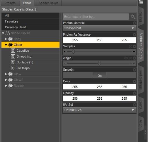 The Nano Suit seems to be using its own shaders. I have included a screen shot of the shader used on the visor. The photon material settings has matte, chrome, water, glass, & transparent. It defaults to transparent. I have set it to glass and I still get the same white render.