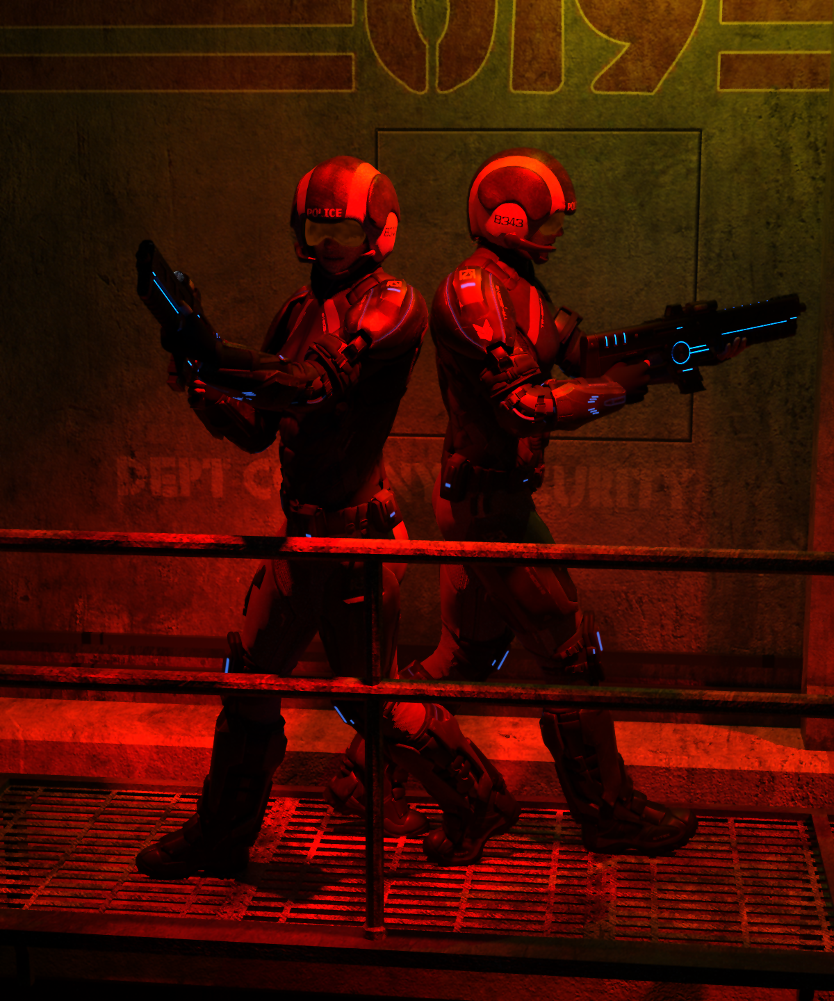 Using a few different lights with this one - three red spotlights at different angles and a yellow point light, then the emissives on their uniforms, guns and visors. Would love to have feedback on how to improve.