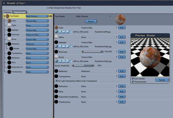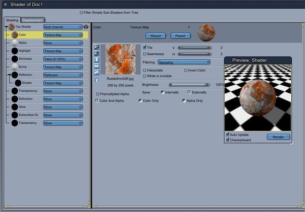 Rust? I decided to look under the hood of the rust shader that comes with Carrara in the scene wizard. It seems to be based on three texture maps.
