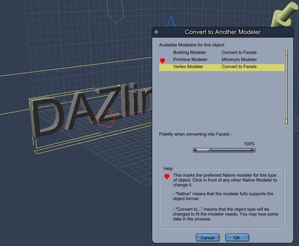 1) Creating an object in Carrara’s vertex modeler, the spline modeler, the metaball modeller, the plant editor, or terrain editor