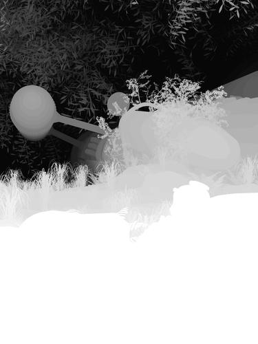 I created a layer mask from one of the original layers I created from the background layer and copied and pasted the depth pass into it. I inverted the color and cranked up the brightness and contrast to create a dramatic difference between the foreground and background areas of the scene, while still trying to retain the gradient between the two,