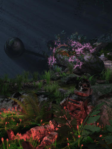 I applied the Poster Edge filter to one of the copies of the background layer below the layer mask. The effect is the hybrid look that I wanted, with the astronaut skeleton and immediate environs looking more photographic and transitioning to more of a comic book feel the further away from the camera.