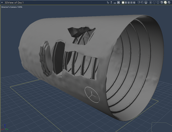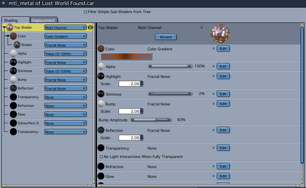 Instead I did a multi-channel mixer. Source 1 is just a slightly modified version of the Basic Dull Metal shader that came with Cararra (I just darkened the color a little bit and upped the reflection, which you can't see at all in this test render). Source 2 is the rust. It's an orange and an orangish brown mixed using a cellular function. The shininess is turned almost all the way off on the rust and there's a little bit of a bump to it, generated using the same cellular function that is mixing the colors.