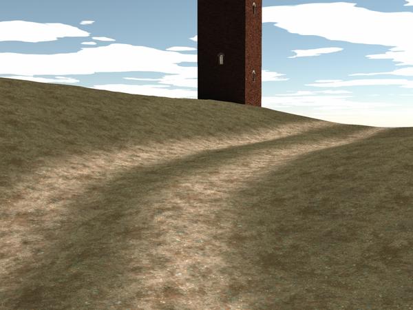 I've had my first tentative play in the terrain editor. What I wanted was basically a round hill with a rutted cart track going around it and over the top. I think I've come reasonably close to that.