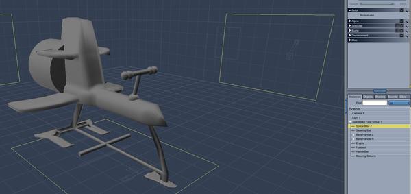 For my alien biker dude entry, I have constructed a stylized flying machine. It is a combination of a vertex object and some primitives. I wanted to apply my rust shader (see prior posts for methodolody) to some places where the bike chassis comes in contact with moveable parts such as the steering column, wings, and the underside of the landing struts.