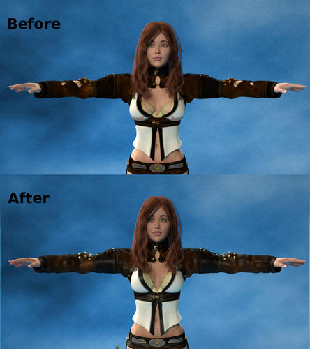 The clothing is from the Riae Outfit for V4. As you can see in the before image, the materials come into Carrara/Octane rather flat, dull, and lifeless. The Mats/Shaders for this outfit were rather easy to fix. For everything but the metal bits I just converted specular from "RGB Color" value to "Gray Scale Color" which gives a simple 0-1 slider scale. I then set the specular to .0.025 and adjusted the roughness to 0.4 to give a nice even seen to the leather. For the metal I just adjusted the specular RGB Color to a lighter tan-ish color to improve the brass/gold highlights.