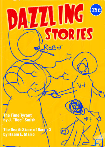 OK, so one of mine will be an alien biker dude on a rusty robo flying metal doohickey with a woman slung over his shoulder. Comic alien dude and silly amazon female works well for that.