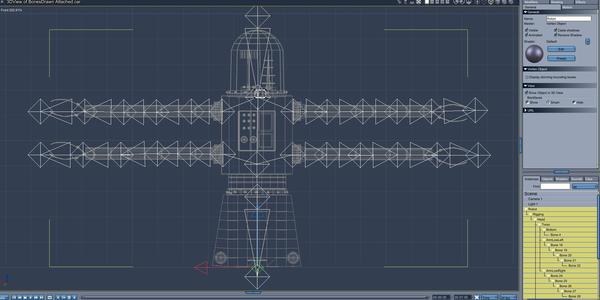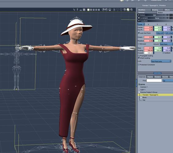 I loaded my Femme mannequin in the vertex modeler. I modeled an off-the-shoulder glamorous dress in the same vertex object, but as a different polymesh. Before you attach the bone skeleton to the figure mesh,