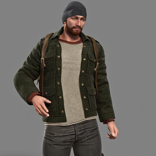 It includes not only a highly detailed clothing set, but also a mature skin/character set, a complete hair+beard+brows hair setup, as well as a modified baseball stick (ready to kill some zombies), and a classic and functional leather backpack.